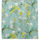 Pretty pattern of budgies and yellow and white flowers on a soft turquoise background.