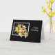 A note card with a yellow and white frangipani in a white frame with black background. Card reads happy birthday in a white fancy font.
