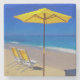 Yellow beach umbrella and chairs on pristine stone coaster