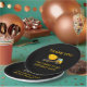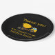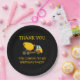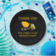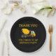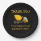 Yellow and black cement mixer truck child's birthday party "thank you" paper plates. Text says, "Thank you for coming to my birthday party"