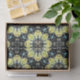 Seamless decorative geometric pattern featuring yellow stylised geometric flowers on a black and blue background.