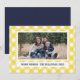 A modern and rustic holiday card featuring personalised photo on a yellow and white gingham inspired background.