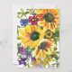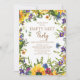 Colourful yellow, blue, and purple watercolor spring wildflowers on white Empty Nest Party invitation with a beautiful calligraphy script font. The back of this card is a matching floral. Celebrate your last child's departure from the nest with an Empty Nest Party. Contact us for help with customisation or to request matching products.