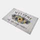 Rustic floral welcome doormat printed with a white wood grain look with welcome written in rustic letters in an arch above a flower bouquet with yellow sunflowers and flowers in blue and berry twigs. Personalize with your last name below.