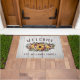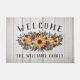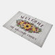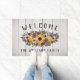 Rustic floral welcome doormat printed with a white wood grain look with welcome written in rustic letters in an arch above a flower bouquet with yellow sunflowers and flowers in blush pink and plum and greenery and berry twigs. Personalise with your last name below.