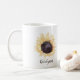 This coffee mug features a watercolor style illustration of a sunflower in yellow and brown. Your name or other personalised text is spelled out below in dark brown script. Use the template field to enter your own name or other message.
