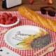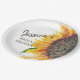 Yellow and brown boho-style watercolor sunflower on white bridal shower paper plates. Personalised with the bride's name. Contact us for help with customisation and matching products.