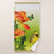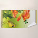 Beautiful illustration image of a yellow bird with a orange Orchids flower with a green and black butterfly flying beside the tropical plant.on a oil print image