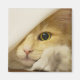 Photograph of a yellow Norwegian Forest Cat peeking out from under a sheet.