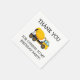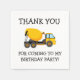 Yellow cement mixer truck child's birthday party "thank you" paper napkins. Text says, "Thank you for coming to my birthday party"