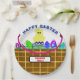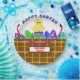Two tone brown Easter basket with decorated eggs in pink and green Easter grass and pink handle. Happy Easter typography in deep blue. Cute yellow chick hatched from colourful striped egg in red, yellow, blue, green and purple. Family Name typography in red inside black and white rectangle. Original Artwork Design © TamiraZDesigns.