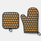 Safely handle baking trays, cookie sheets and muffin tins from the oven with this pot holder set with black trim that features the photo image of a yellow Dahlia flower on a black background and printed in a repeating pattern. A fun, floral design! Select from square pot holder style or oven mitt style, or order a set of both. Image printed on one side only.