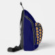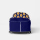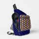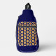 This navy blue crossbody sling bag with zippered pocket goes where you go when biking and hiking and features on the front, zippered pocket the image of a yellow Dahia flower printed in a repeating pattern on a solid, navy blue background. A fun, floral design!