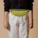 Stylish fanny pack with matching green trim for the on-the-go person and features the photo image of a yellow Dahlia bloom on a lime green background and printed in a tiled pattern. A fun, floral design! Back of fanny pack is black.