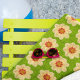 Have fun in the sun and beach with this large beach towel that features the image of a yellow Dahlia flower on a lime green background and printed in a repeating pattern. A fun, floral design!