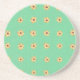 Painting of a pattern of yellow daisy flowers on a light green background, printed on coasters.