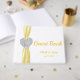 Elegant diamond heart with a yellow ribbon decorate this guestbook. Wedding guest books are fun for both the couple and their celebrants. Invite attendees to leave you well-wishes at your reception, and you're guaranteed to have a keepsake to look back on for years to come. Plus, your guests will get to leave their mark on your event, not to mention put in writing whatever they didn't have a chance to express in person on the big day. Personalise the book by changing the text in the fields provided. You can change font style, size, and colour.