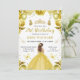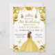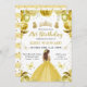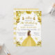Elegant watercolor Red Haired princess in yellow dress design with yellow and gold flowers, butterflies and gold glitter confetti.