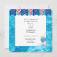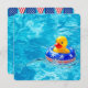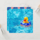 Yellow duck floating with an American flag life ring in a swimming pool wearing a patriotic hat for a pool party invite.