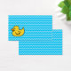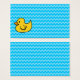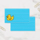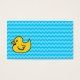 Cartoon yellow rubber duck against aqua wavy pattern.
