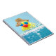 Cute yellow rubber duck with sunglasses and sun hat in water splash on an aqua blue background.