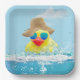 Cute yellow rubber duck with sunglasses and sun hat in water splash on an aqua blue background.