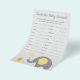 Our yellow and grey elephant themed baby animals name game is great to have at any baby shower. Our cards have a list of 20 animals and lines for the guests to write on. Have your guests guess what the animals' babies are called - it's harder than you'd think! Woodland animals on cards include a fox, moose, bear, racoon, and rabbit. ANSWER KEY: 1)Cub 2)Kitten 3)Chick 4)Calf 5)Fawn 6)Puppy/Pup 7)Duckling 8)Calf 9)Tadpole/Polliwog 10)Kid 11)Gosling 12)Foal/Yearling/Colt/Filly 13)Joey 14)Infant 15)Piglet 16)Pup 17)Bunny/Kit 18)Lamb/Lambkins 19)Hatchling 20)Cub/Pup/Whelp