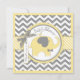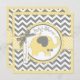 Yellow elephant with bow-tie and bird perched on shoulder and grey and white chevron print and 3D-look bow and ribbon for a boy baby shower invitation card.