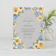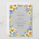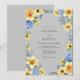 This design features a cheerful and bright aesthetic perfect for a seasonal outdoor ceremony. A palette of sunny yellow and cool periwinkle blue pops against a sophisticated slate gray background. Lush watercolor illustrations of yellow roses, lilies, and vibrant blue hydrangeas create an elegant composition. Delicate greenery and soft foliage add a botanical touch to the artistic arrangement.