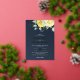 This contemporary floral wedding invitation features a classy and elegant bouquet of yellow watercolor roses, complemented with delicate greenery and accented with shiny real foil golden leaves over a navy blue background. Easily add the Bride and Groom names and the wedding date in gold foil, and all the other details in elegant white fonts.