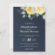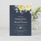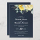 This contemporary floral wedding invitation features a classy and elegant bouquet of yellow watercolor roses, complemented with delicate greenery and accented with golden leaves (faux gold) over a navy blue background.