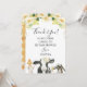 Sweet farm animals themed baby shower thank you card featuring some lovely yellow or gender neural floral arrangements and five cute farm animals. This oink, moo, neigh, farm or farmyard baby shower card is ideal for a gender neutral farm themed baby shower and a sweet way to thank guests for coming to your farm themed baby shower.