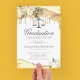 Elegant law school graduation party invitations featuring yellow and gold glitter agate crystal edges, white watercolor florals, the justice scales, and a formal celebration template that is easy to personalise.