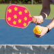 Yellow floral pattern on pink pickleball paddle