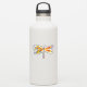 Artistically painted, floral dragonfly in contrasting orange and purple with yellow, bright, blooming California poppy and blue wildflowers on white background.