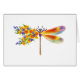 Artistically painted, floral dragonfly in contrasting orange and purple with yellow, bright, blooming California poppy and blue wildflowers on white background.