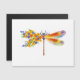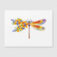 Artistically painted, floral dragonfly in contrasting orange and purple with yellow, bright, blooming California poppy and blue wildflowers on white background.