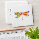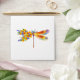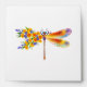 Artistically painted, floral dragonfly in contrasting orange and purple with yellow, bright, blooming California poppy and blue wildflowers on white background.