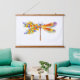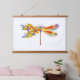Artistically painted, floral dragonfly in contrasting orange and purple with yellow, bright, blooming California poppy and blue wildflowers on white background.