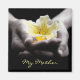 A floral photograph of a delicate yellow flower held in a pair of hands. Personalise by adding your mother's name to this picture of a Hotei Rhododendron.