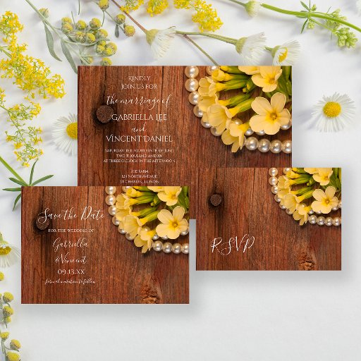 Announce your upcoming casual yet classy farm style nuptials with the pretty Yellow Flowers, Barn Wood and Pearls Country Wedding Save the Date Postcard. This rustic chic custom ranch theme keep the date postcard features a quaint close up floral photograph of little yellow flower blossoms, white pearl necklace and brown weathered barn wood with a rusty nail head. Perfect inspo for an informal barn party marriage ceremony and reception event.
