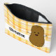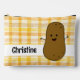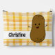 Adorable toiletry bag featuring a cute happy cartoon brown potato. The background is a cute classic pattern of white and white watercolor check gingham. A template to add your name to personalise.