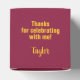 GRAD in bold yellow gold lettering wraps around the front of these maroon 2" square graduation party favour boxes with your name and thank you message on the top.