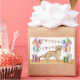 Destei's original cartoon illustration of a cute yellow Golden Retriever breed dog. The dog is placed in a colourful birthday setting with pastel colour birthday balloons, gifts and a bunting banner. The pastel colours include pink, green, blue, red, orange and purple. The dog is standing on a yellow wood floor texture and the background has a playful pastel colour polka dot pattern.