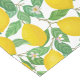 Decorative design of a pattern of yellow juicy lemons on branches with green leaves and delicate white flowers on a white background.