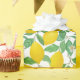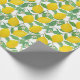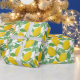 Decorative design of a pattern of yellow juicy lemons on branches with green leaves and delicate white flowers on a white background.