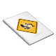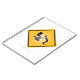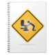 Notebook with a yellow traffic warning sign with an icon vomiting over a toilet showing a hangover.