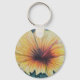 A keychain printed with a hand-drawn yellow hibiscus design.
