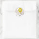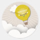 A sticker featuring an illustration of a yellow hot air balloon floating above the clouds with sunburst background. Personalise the text. Matching birthday party invitations are available at Jill's Paperie.