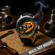 This bold watch face prominently features a yellow hot rod car with custom red and black flames painted on its side. The car is depicted on a dark road, with vibrant orange and yellow flames erupting from the ground beside it, resembling fire in grass. Dark, stylised clouds are visible in the background, creating a powerful, intense automotive scene.